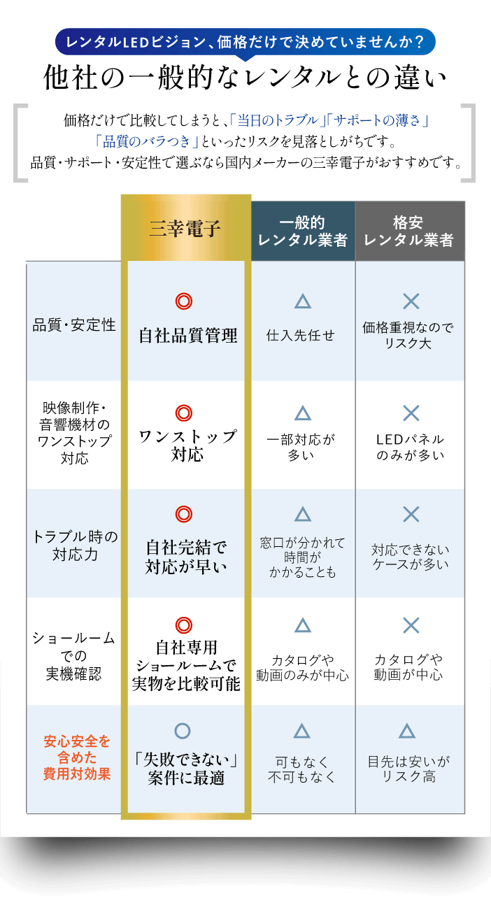レンタル用LEDビジョンも安心の国内品質で、「安心して任せられるレンタル」を提供しています。